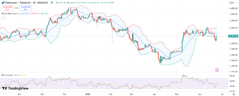 Actualmente, Ethereum cuenta con una capitalización de mercado de $290.86 mil millones y cotiza en torno a los $2.409. Desde una perspectiva técnica, el RSI ha subido a 48 tras haber estado cerca de la zona de sobreventa. Esto apunta a un sentimiento de mercado que está pasando de neutral a alcista.