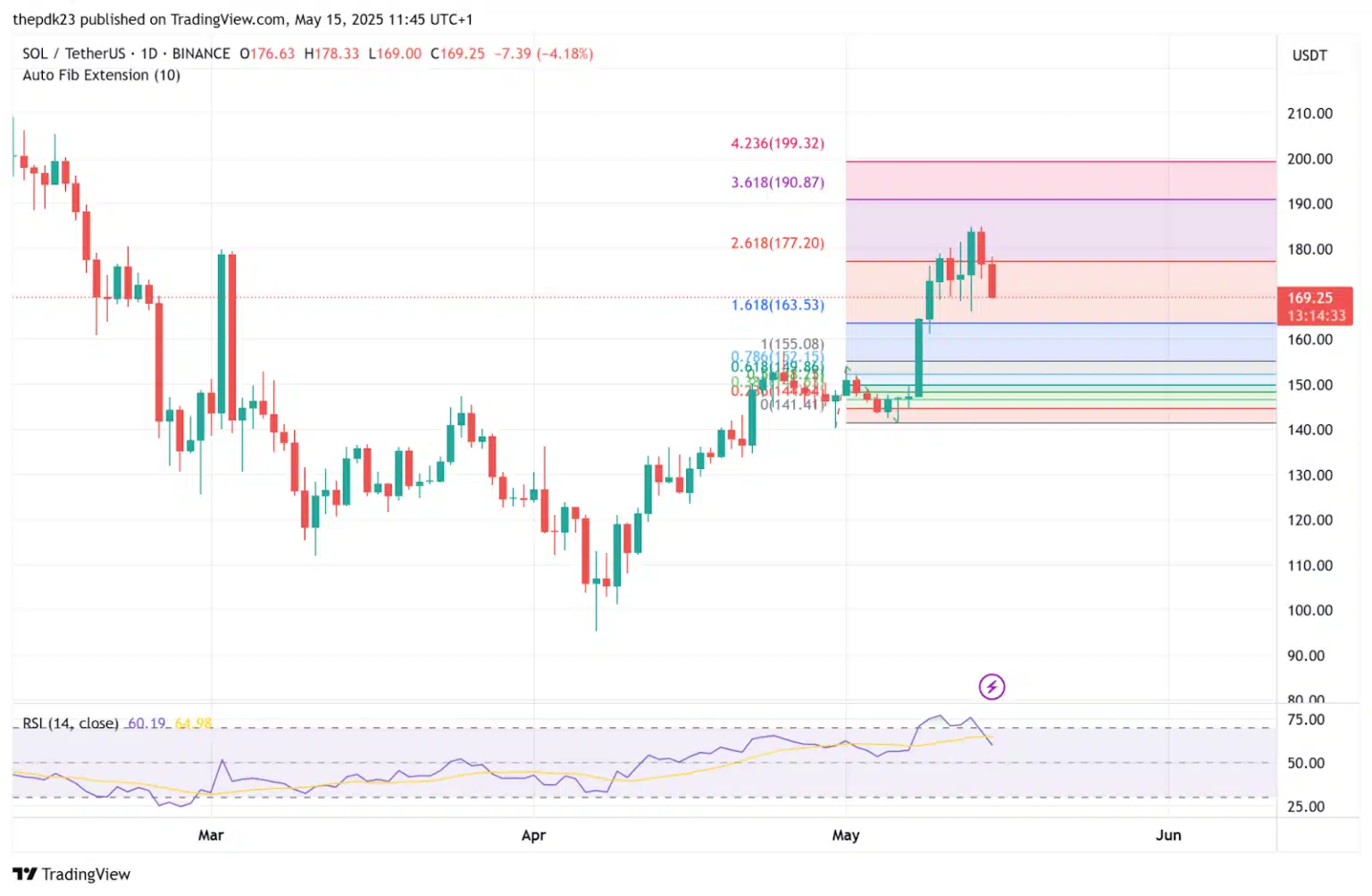 Al momento de escribir este artículo, el precio de Solana (SOL) ronda los $169.23, con una caída del 6% en las últimas 24 horas, pero un avance del 10% en los últimos siete días. Esta volatilidad ha sido moderada dentro del contexto general de un repunte alcista que podría continuar.