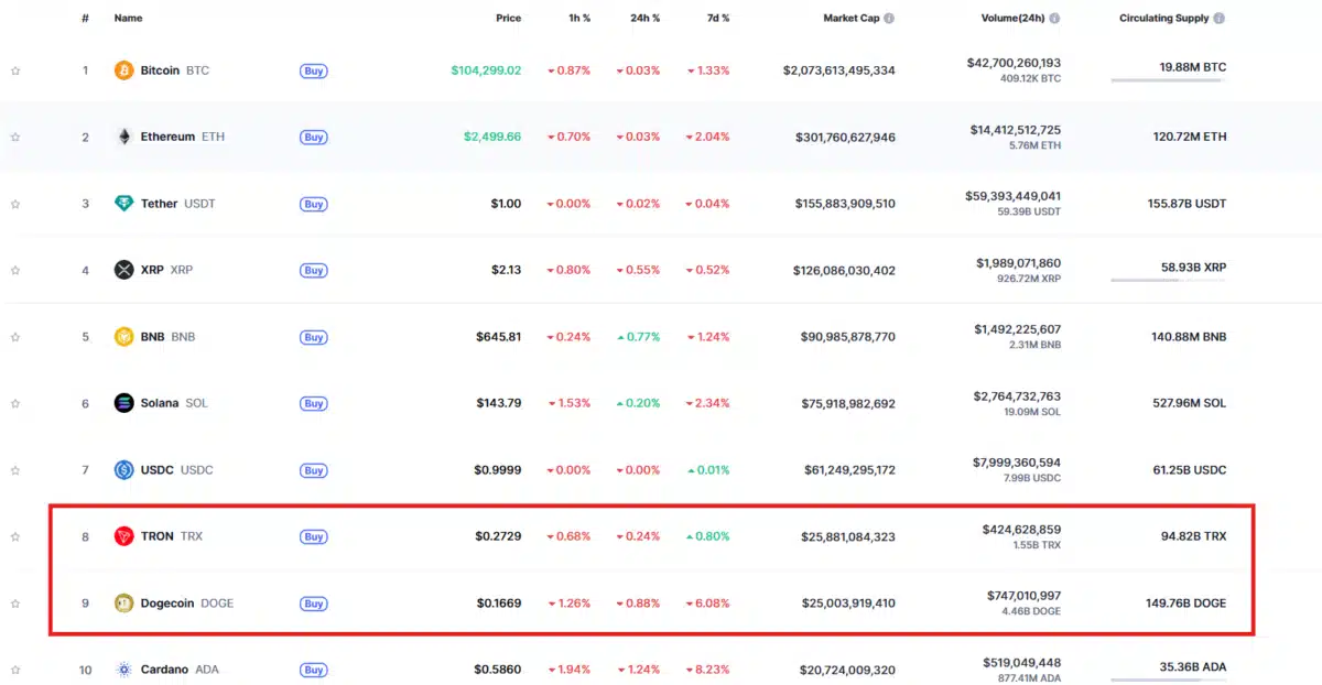 Según datos de CoinGecko y CoinMarketCap, TRX alcanzó recientemente una valoración de $25.900 millones de dólares, situándose aproximadamente $500 millones por encima de Dogecoin. Y aunque este cambio puede parecer puntual, las cifras muestran una tendencia sostenida.