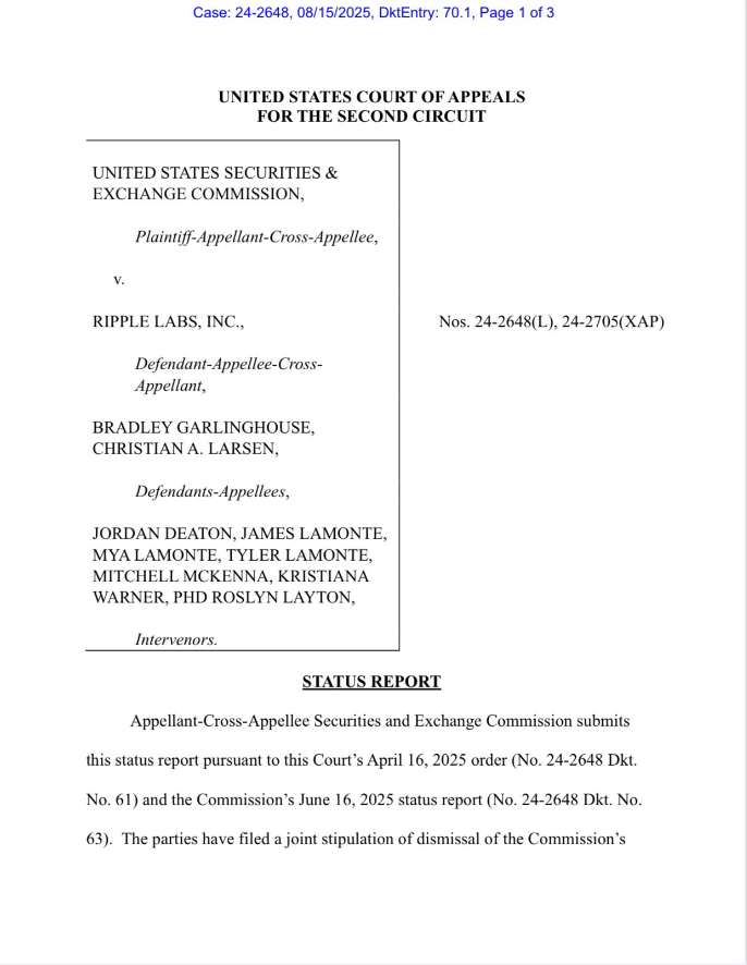 Informe de estado presentado por la SEC este 15 de agosto de 2025. Fuente: @FilanLaw